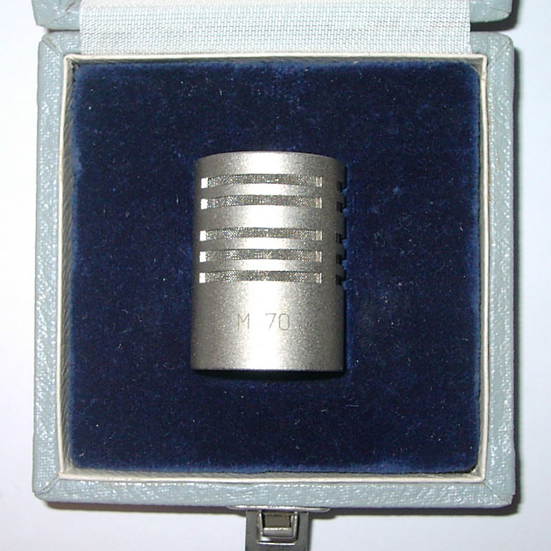 ![]() | ![]() | Rok: sedmdesátá léta Typ: kondenzátorový Kondenzátorová mikrofonní kapsle M70 z Gefellu (kardioidní směrová charakteristika). Používala se k předzesilovačům RFT Mikrotech Gefell MV691 a dalším. |